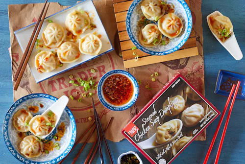 Xiao long bao, aka soup dumplings, are so delicious and comforting and just fun. Instead of floating in soup, the soup is actually inside the dumplings. The broth is ginger-y, and the filling includes chicken, onion, green onion, and more. The TJ’s website suggests nibbling a little hole in your dumpling to let the soup run out and cool before enjoying.