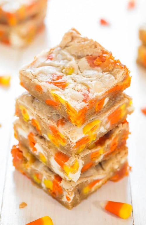 If you love candy corn and have already grabbed a bag from the grocery store, you’ll be obsessed with Averie Cooks’ white chocolate blondie recipe that’s loaded with them. Again, it’s just some mixing and dumping and baking, and these look like a fall serotonin boost that’s very much worth that little effort.