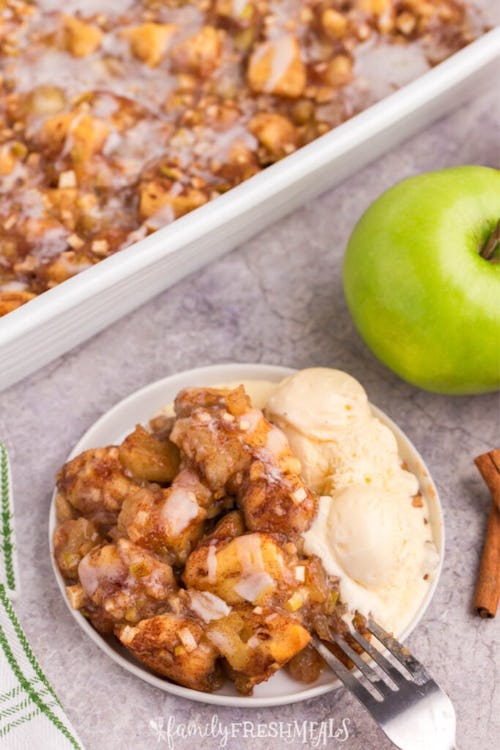You only want to buy four ingredients, you say? Family Fresh Meals has you covered there, too. This bake uses a canned cinnamon roll base, topped with apple pie filling and a little extra pie spice, with a green apple diced and sprinkled throughout for a bit of tartness.