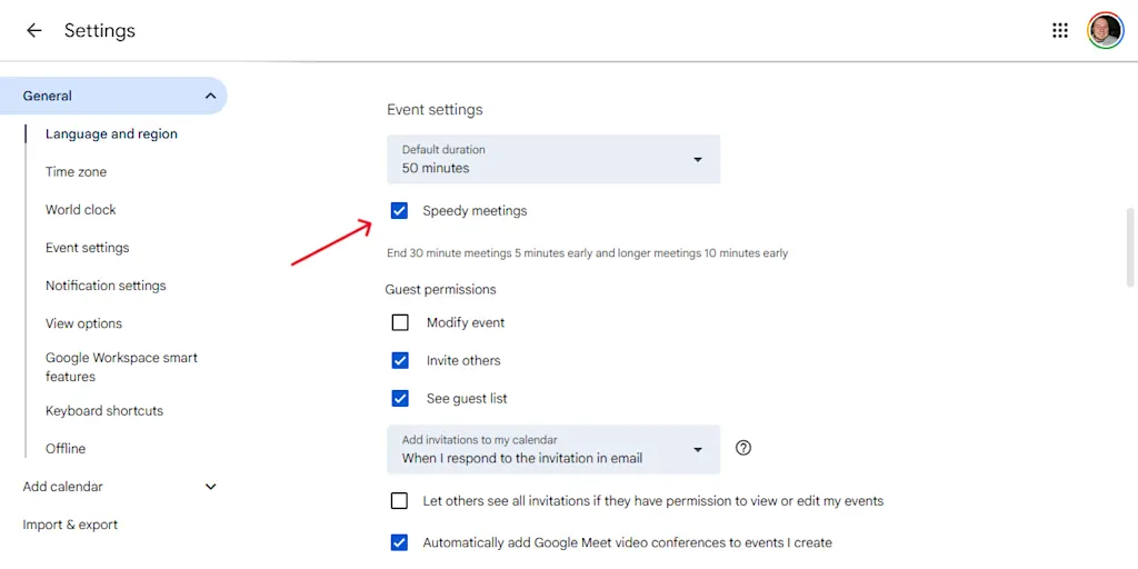 Don’t be a time miser. Instead, go to Settings > General > Event settings > Default Duration and click the “Speed meetings” box.