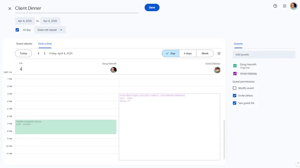 Google Calendar instantly overlays the schedules of everyone you invited, so you can see exactly who is busy and who is free and at which times. Drag the event block to the first open slot that works for everyone.