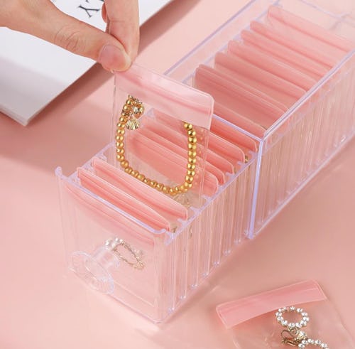 This jewelry organizer is great whether you’re home or traveling. That’s because it allows you to put one piece of jewelry in each of the 20 small, protective pouches. This prevents them from tangling or getting damaged when you’re not wearing them. All the pouches fit nicely into the acrylic container — and if you’re traveling, you can just take the jewelry you want to wear on your vacation instead of everything you own.