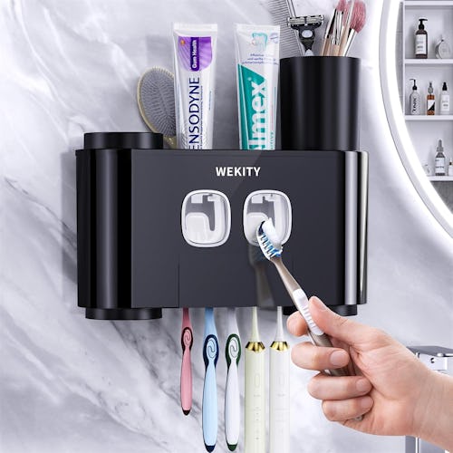 Declutter your bathroom countertop and keep your toothbrushes, toothpaste, cups, mouthwash — you name it — in this wall-mounted organizer. The bottom holds up to five toothbrushes, covering the heads to keep them more sanitary in the bathroom. The top has two built-in toothpaste dispensers and it can also hold four cups for mouthwash, rinsing, or drinking.