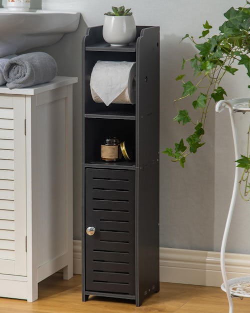 Replace your wall-mounted toilet paper holder with this small cabinet that not only dispenses toilet paper but also gives you a ton of chic storage to instantly refresh your bathroom. It has a top shelf that’s great for candles or plants, a middle shelf that can hold your phone or nicely folded towels, and a covered cabinet that can store all your extra rolls of toilet paper, so they’re handy but out of sight.
