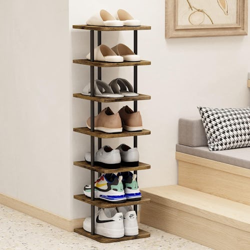 If you have shoes cluttered in your entryway and hate the way it looks, this shoe rack is a slim, modern solution. It can hold up to seven pairs of shoes vertically to take up very little floor space. And it has a cool, geometric design with square, even lines and industrial colors that add a chic touch to your space while neatening things up.