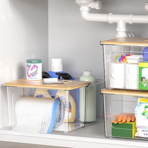 Take the roll of trash bags out of its inconvenient container and instead use this dispenser instead. Not only does it look so clean and polished, but it gives you so much more under-sink storage where you need it. It has a front opening that allows you to grab one bag at a time, a bamboo lid that can double as a shelf, and an open back that can hold your go-to cleaning sprays and supplies. It instantly transforms your under-sink area so you don’t dread reaching in to find the cleaning wipes you need.