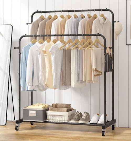 Organize your closet and give yourself way more room with this garment rack. It has a two-tier, high-low design that’s great for hanging everything from shirts and sweaters to pants and dresses. There’s also a shelf on the bottom that’s perfect for shoes, bags, and more. The best part is that it’s on wheels so you can roll it all around your space.