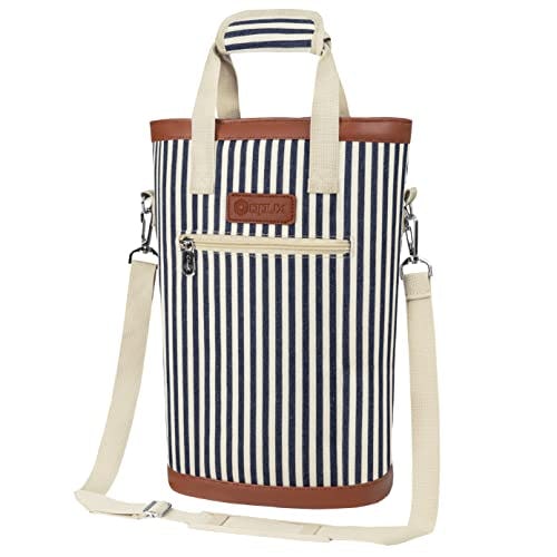 opux Two Bottle Wine Bag Carrier Tote, Insulated Leakproof 2 Bottle Wine Cooler Bag for Travel BYOB Picnic, Portable Wine Case, Gift for Men Women Wine Lover Birthday Party Christmas, Navy Stripes