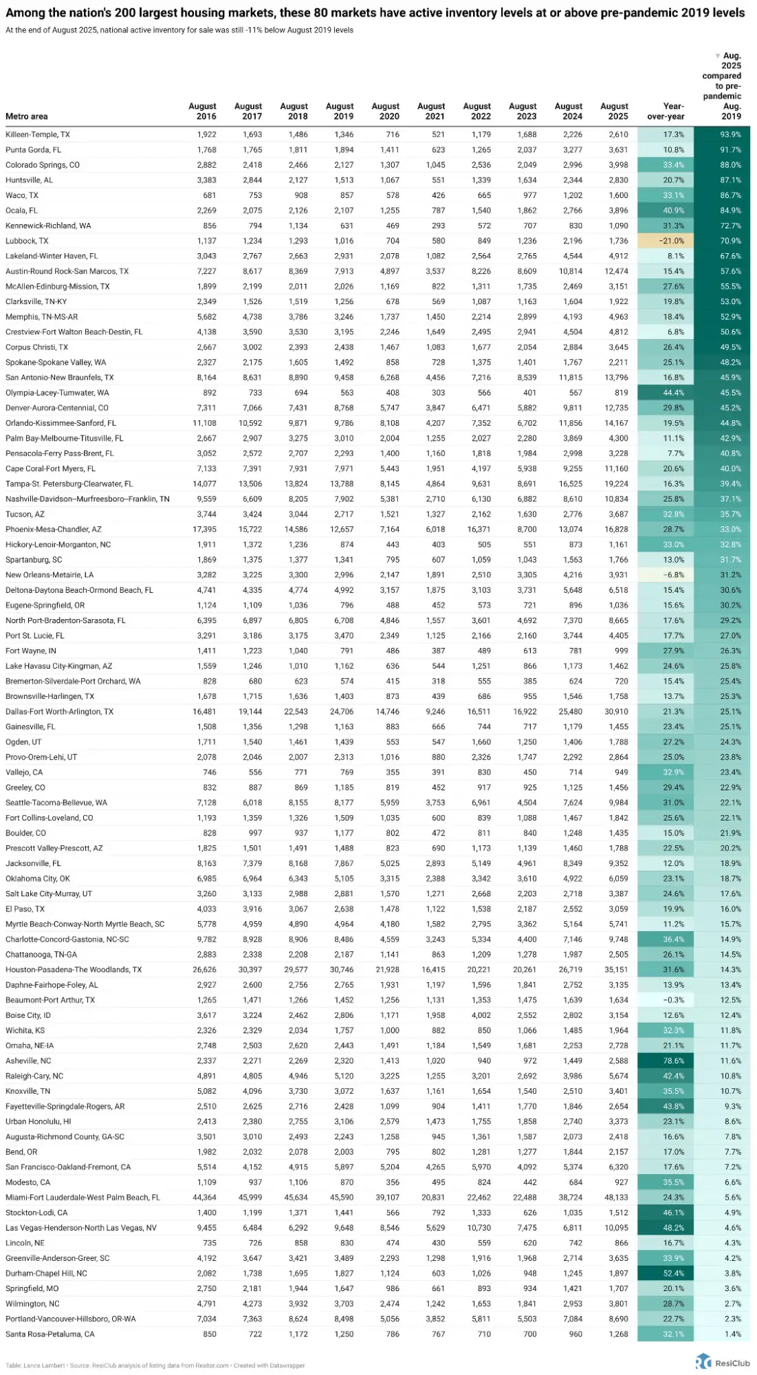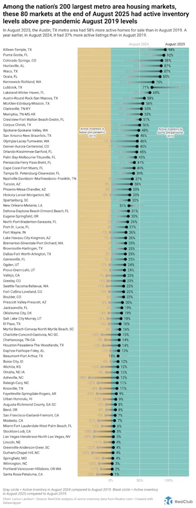 - July 2025: 80 of these 200 major markets were back above pre-pandemic 2019 inventory levels.