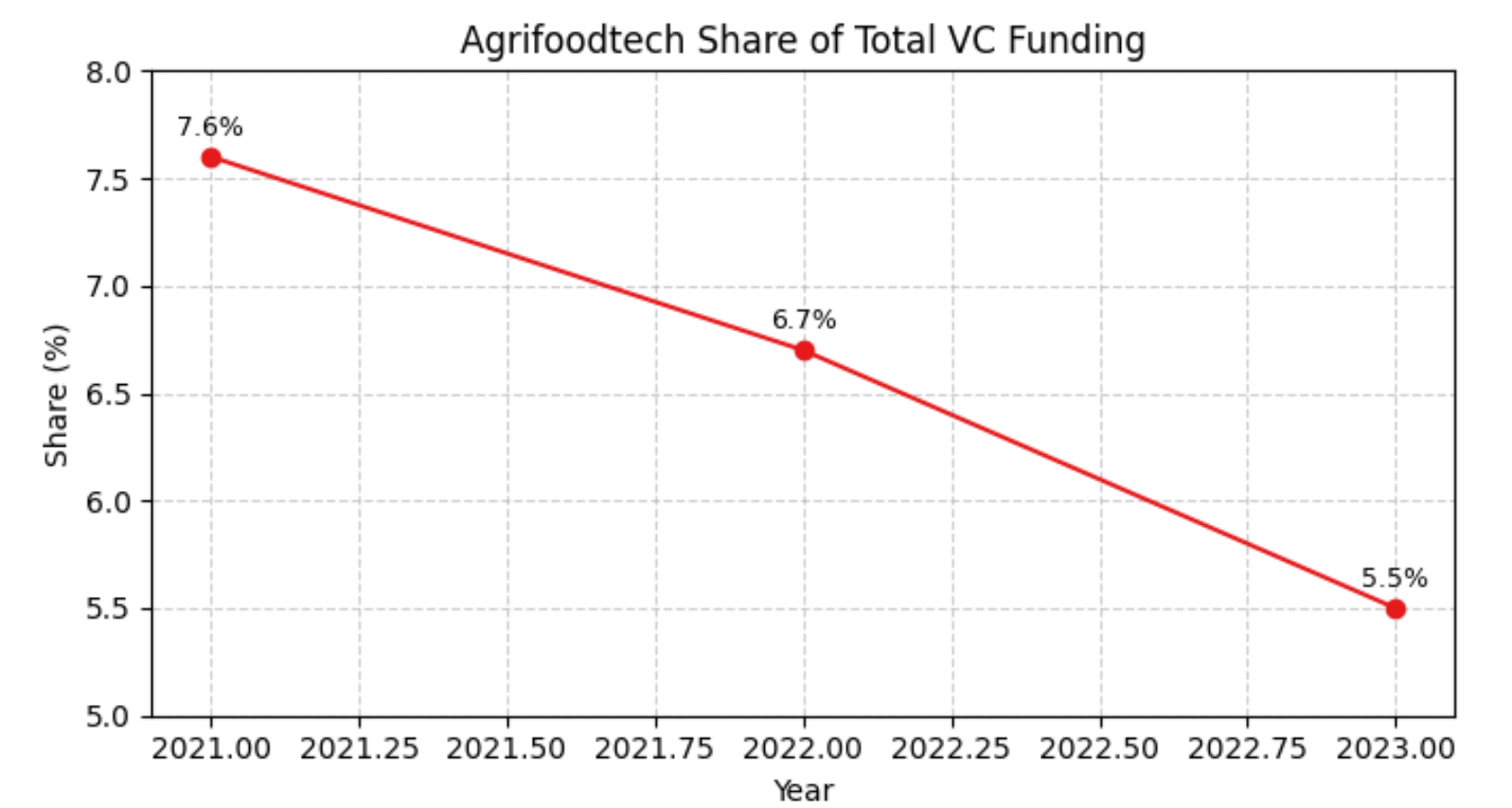 Most new dollars went into consumer-facing e-grocery companies rather than farm-level technologies, because investors see faster growth and less regulatory drag downstream. The agrifoodtech share of venture funding has fallen steadily: