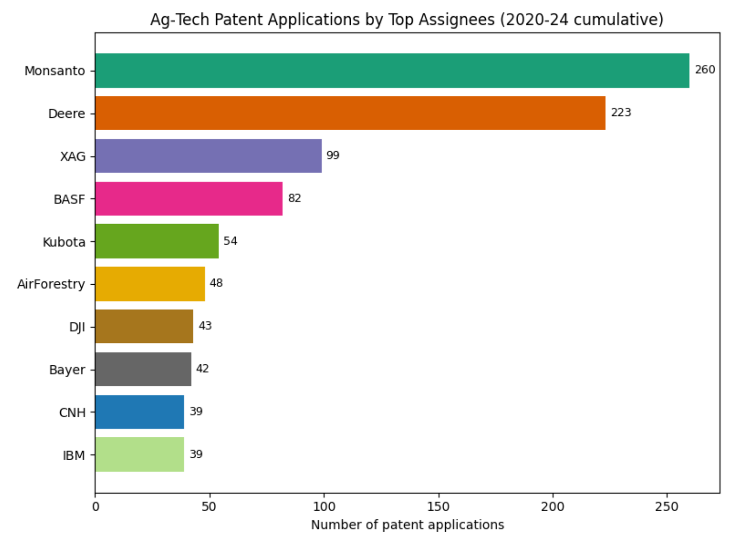 Patent data offer a clue. US agricultural patent publications tripled from 463 in 2020 to 1,433 in 2024. Monsanto and Deere still top the list, but Chinese drone maker DJI, Japan’s Kubota, Swedish forestry‑drone firm AirForestry, DJI and IBM are all among the top ten assignees. Outsiders are staking intellectual‑property claims in areas once considered core to agriculture.