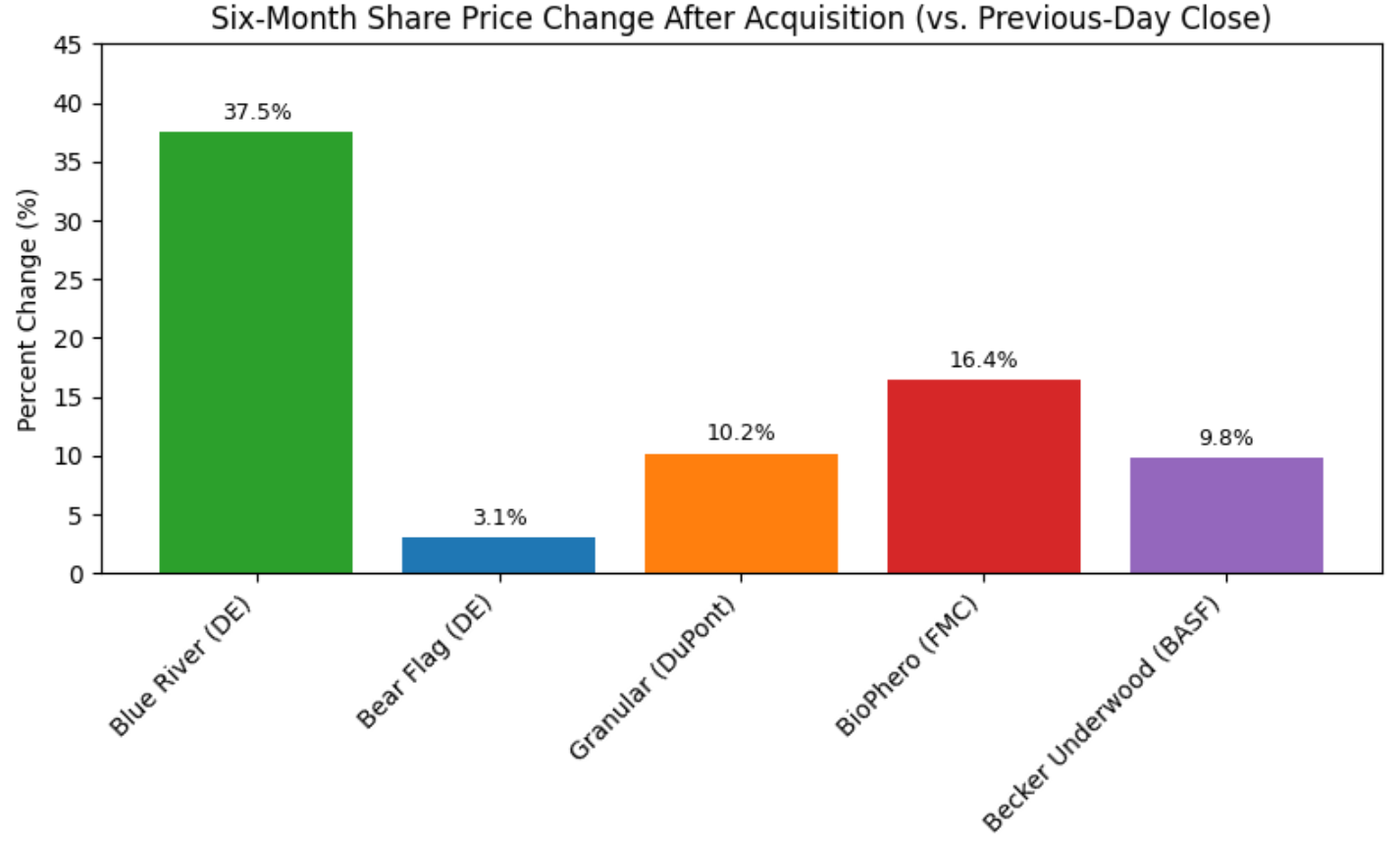 When John Deere bought Blue River Technology for $305 million in 2017, its stock jumped 37.5% over the next six months, translating to roughly $12.3 billion in market value; forty times the purchase price. Even more modest deals were correlated with material gains: DuPont’s added roughly $6.8 billion after the purchase of farm‑software maker Granular, BASF’s market cap grew by $4.2 billion after acquiring Becker Underwood, and FMC’s grew $2 billion after the acquisition of pheromone‑producer BioPhero. Raven Industries’ sale to CNH Industrial (+$2.5 billion) and Valmont’s buy of Prospera (+$0.9 billion) show similar patterns.