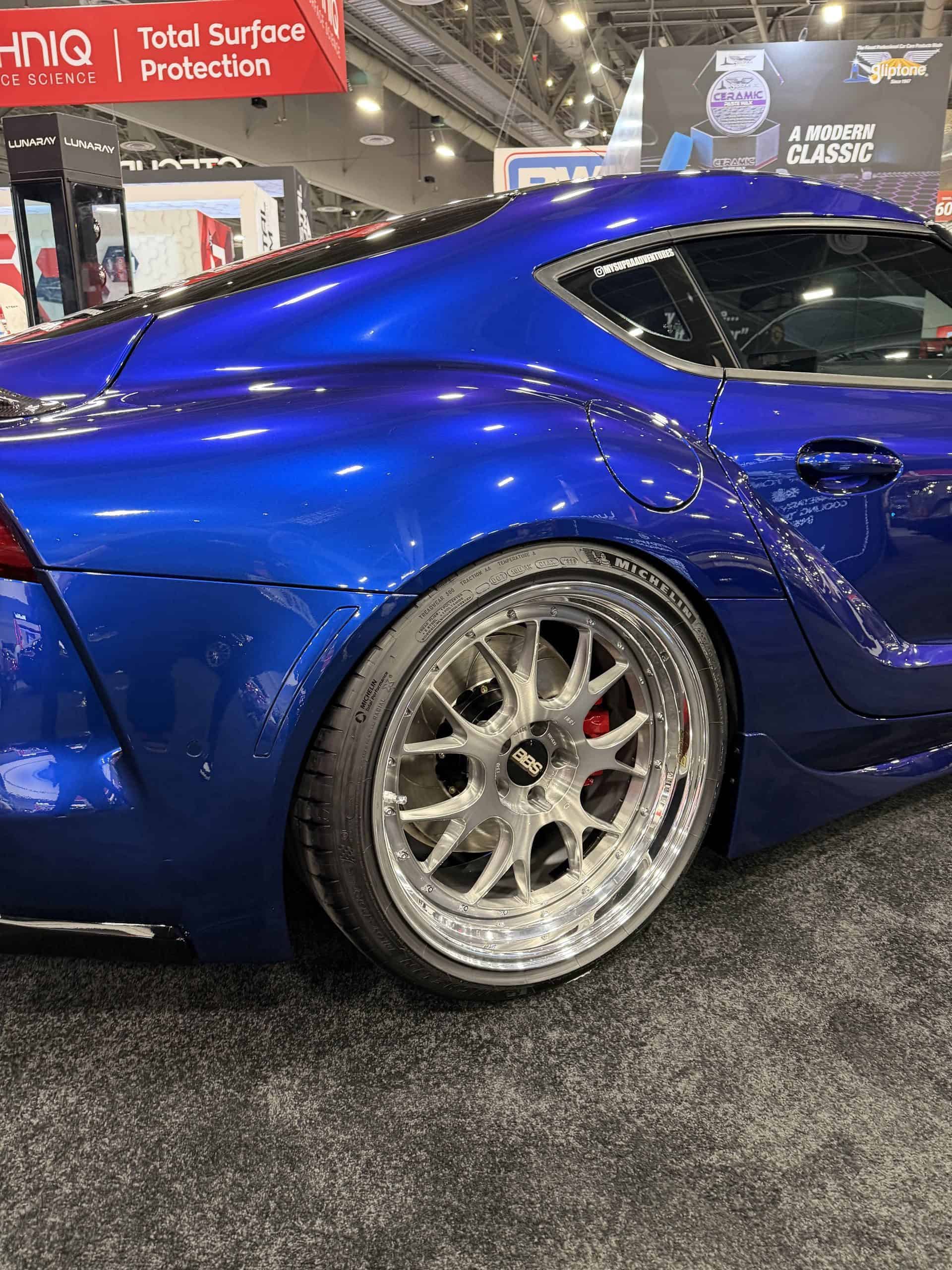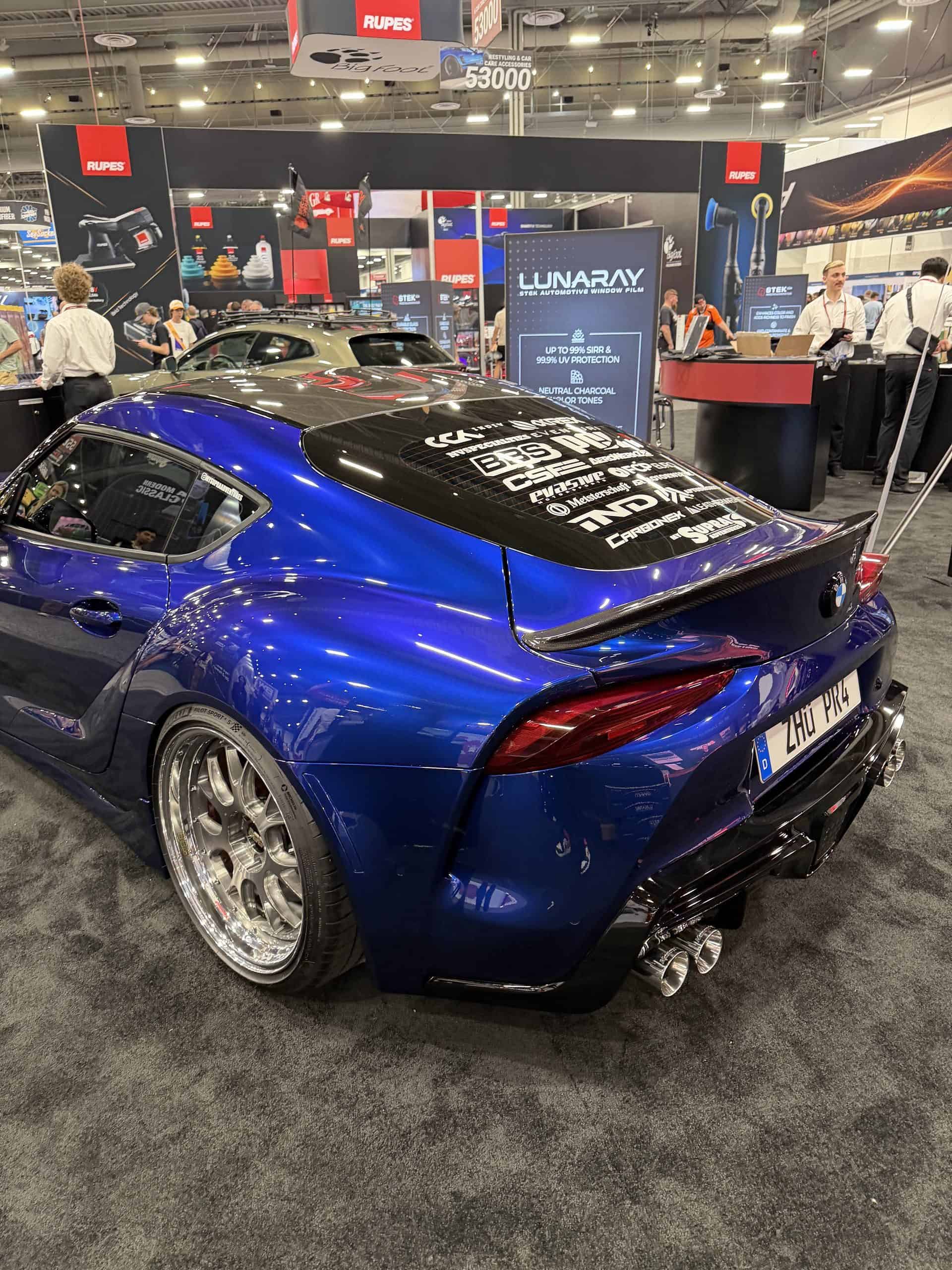 At the most base level, the Z4-swapped Supra is a pretty simple concept. After all, mechanicals and almost everything else are shared between the cars. So, bringing the car into reality should really be a matter of simply lining up a few things and getting the paint right. But, as this is SEMA, no build can simply stop at “good.” So, it’s probably no surprise that there’s a lot more than a bumper swap going on here. A mess of carbon fiber decorates the front, sides, and rear of the car, and 20-inch BBS LM-R wheels front M-badged brake calipers done up in red paint. In back, a roundel decorates the “trunk” lid, along with a carbon fiber spoiler. Quad-exit exhaust tips — with a polished finish, which is a bit of an unorthodox take and looks neat — sit below aftermarket, M4 CSL-inspired taillight designs that seem to borrow the cool Laser technology.