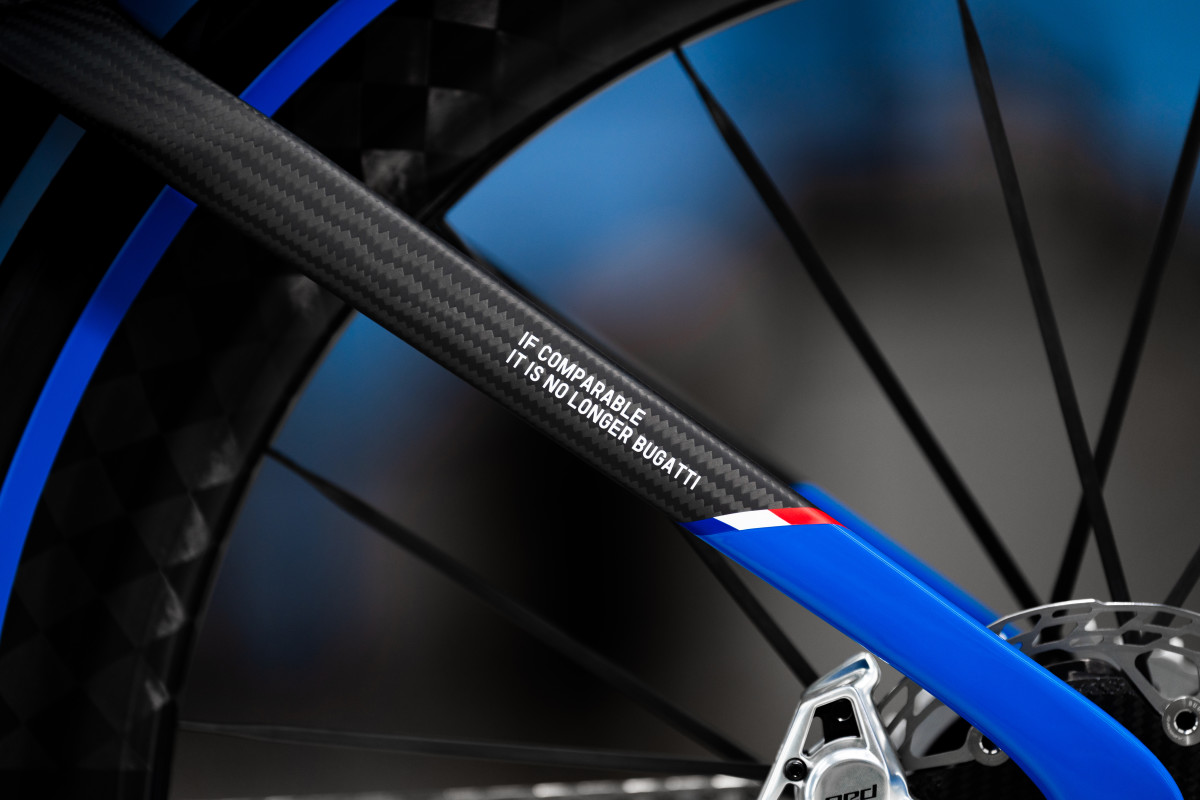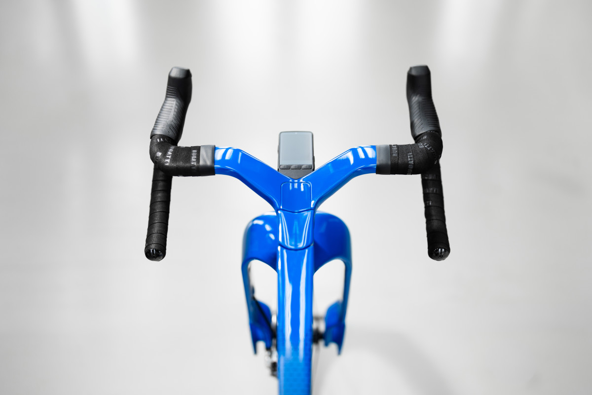 The Factor ONE leans heavily into Bugatti’s obsession with performance. Factor, founded by Rob Gitelis, usually develops its bikes in-house, but with help from Bugatti, it managed to innovate like never before. The UCI-legal design features a widened fork shaped to improve airflow and reduce drag at the leading edge. That works alongside a fully integrated cockpit and frame to maximise efficiency. According to Gitelis, “This project challenged us to rethink every assumption,” which explains why the final product looks so unconventional. Supporting that is the Black Inc Bugatti Hyper 62 wheelset wrapped in Bugatti Continental Grand Prix 5000 TT tyres with a French Racing Blue sidewall. The 62 mm carbon rims weigh just 1.298 grams (less than 3 pounds) per pair, and are tuned for stiffness, power transfer, and crosswind stability. In essence, it’s the cycling equivalent of lightweight forged hypercar wheels.