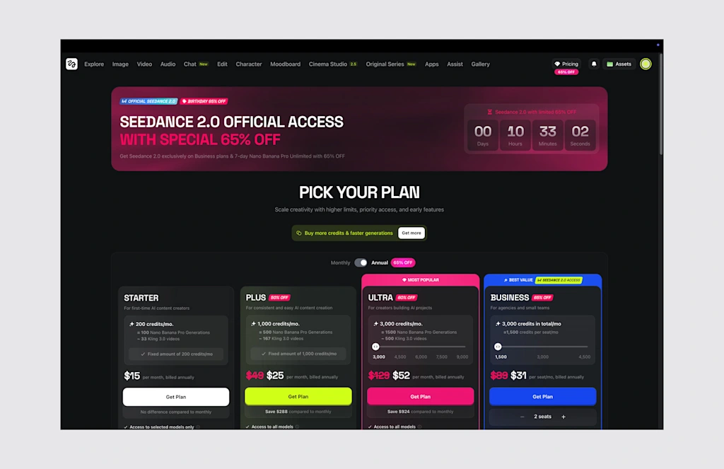 To use Seedance 2.0, you first need to sign up for Higgsfield. This platform is essentially a unified digital workspace that wrangles multiple artificial intelligence video engines—like Seedance, Veo, and Kling—into a single interface. Instead of paying for a dozen disjointed subscriptions, you get a centralized dashboard to use them all.