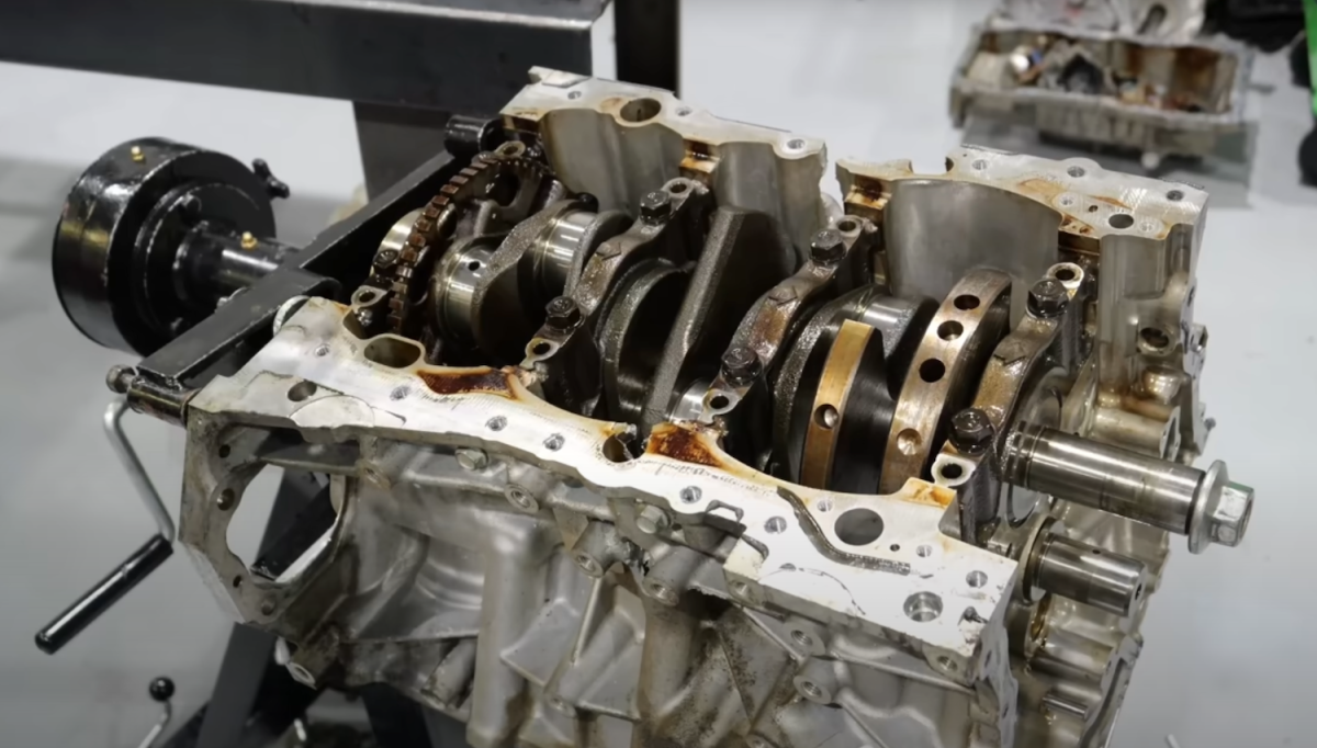 The engine in question still turned over with compression despite large holes in the block. Early inspection revealed an intact timing chain, replaced spark plugs, and the expected amount of carbon build-up for its mileage. However, metal flakes in the oil filter pointed to deeper issues. Removing the valve covers showed camshaft wear and rust, while timing chain guides were cracked and at risk of failure.