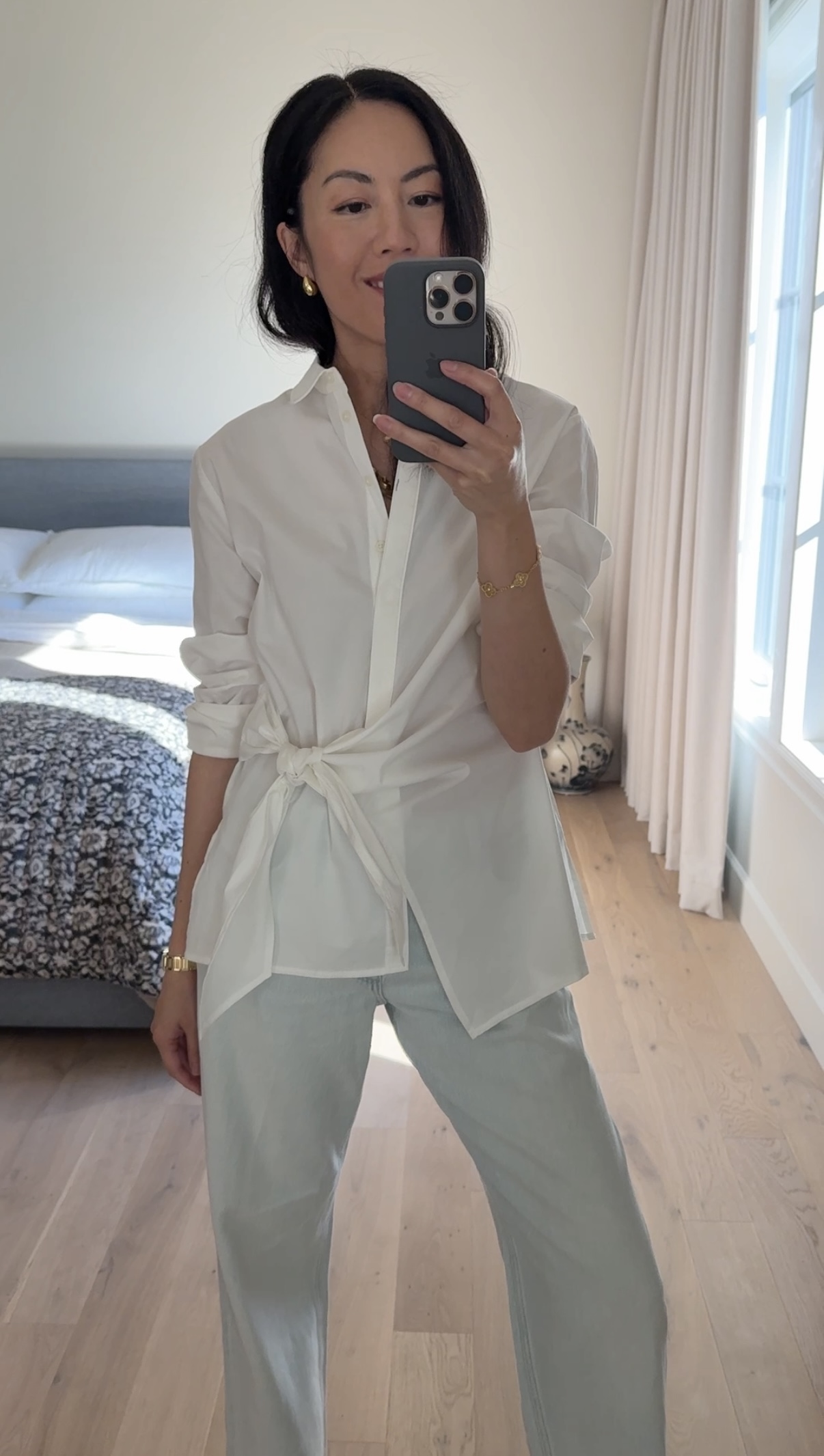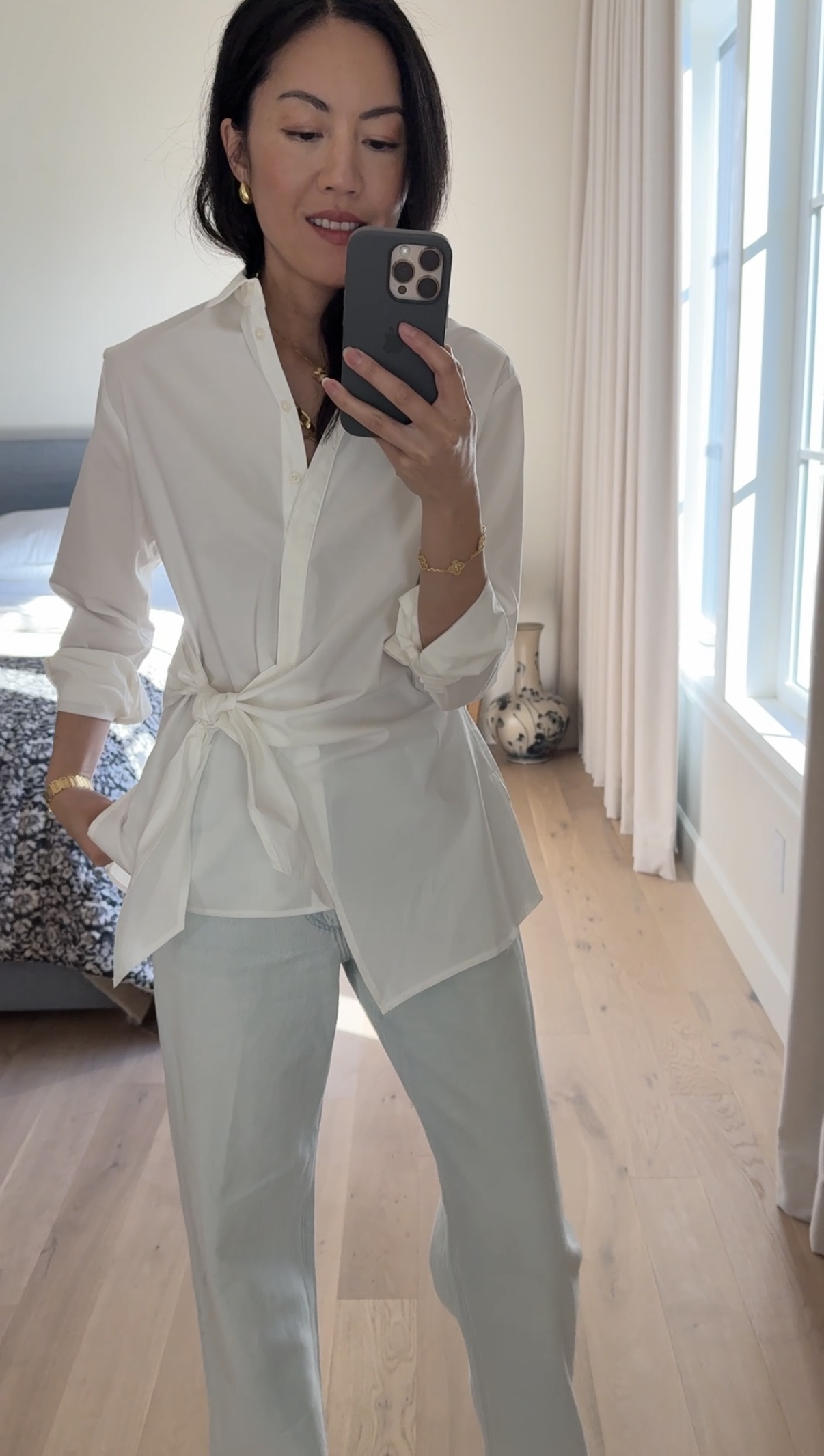 The classic white shirt, but different. Shirts like these are really great for concealing hormonal bloating or midsection worries. The key is to tie it a bit looser than you think you should – the result is a more elegant and natural drape of the material.