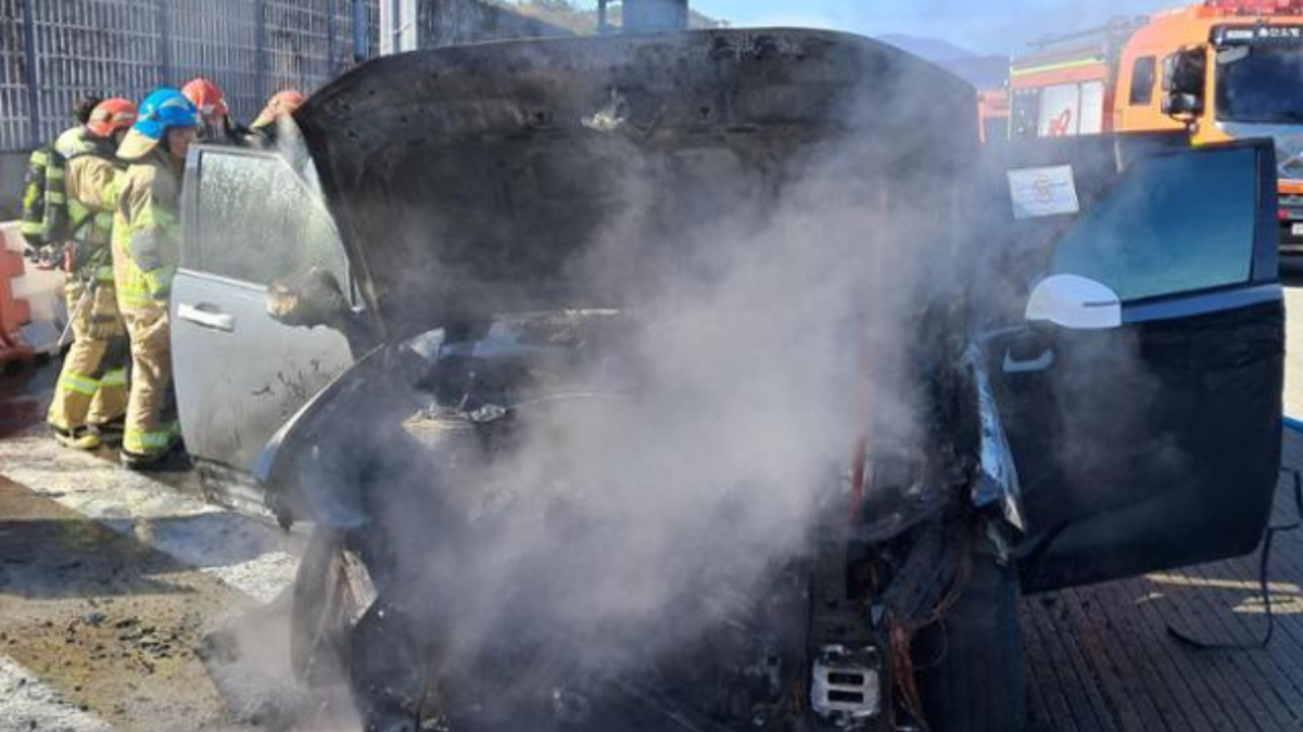 A development-phase Hyundai Santa Fe test vehicle was destroyed after catching fire during road testing in South Korea. Fire crews fully extinguished the blaze, but not before the vehicle was engulfed and rendered a total loss.