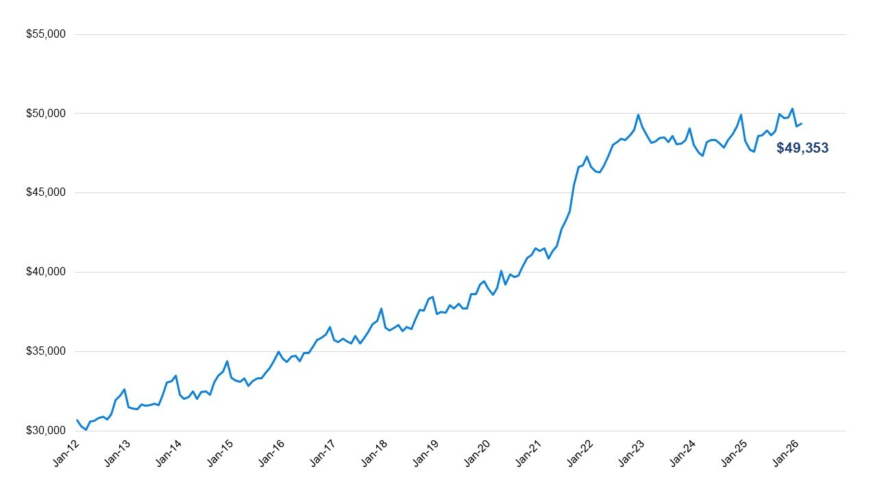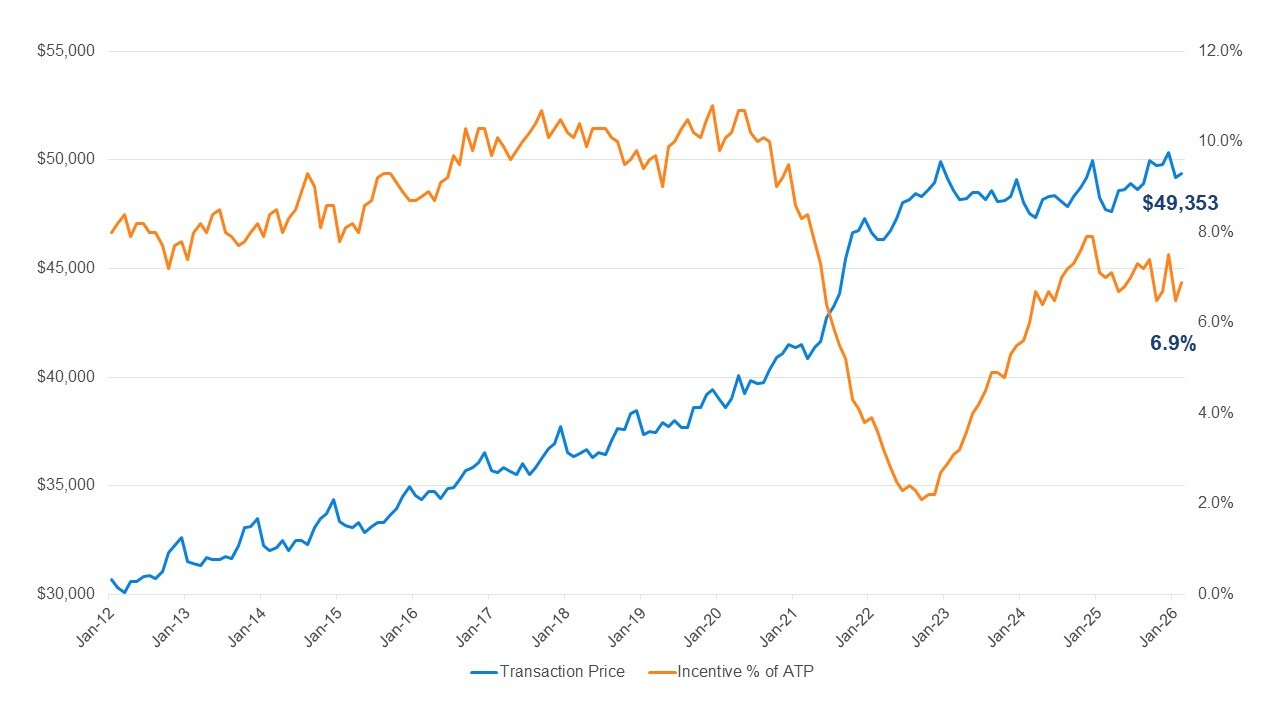 Meanwhile the broader market looks far calmer. The industry average transaction price, what buyers actually pay, reached $49,353 in February. That’s up 3.4 percent from a year earlier and just 0.3 percent higher than January. Prices are still rising, but at a far more normal pace than during the pandemic-era chaos.