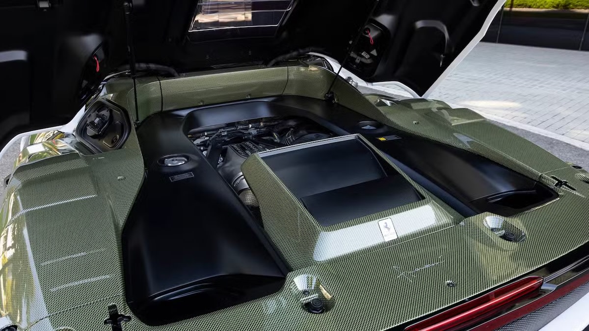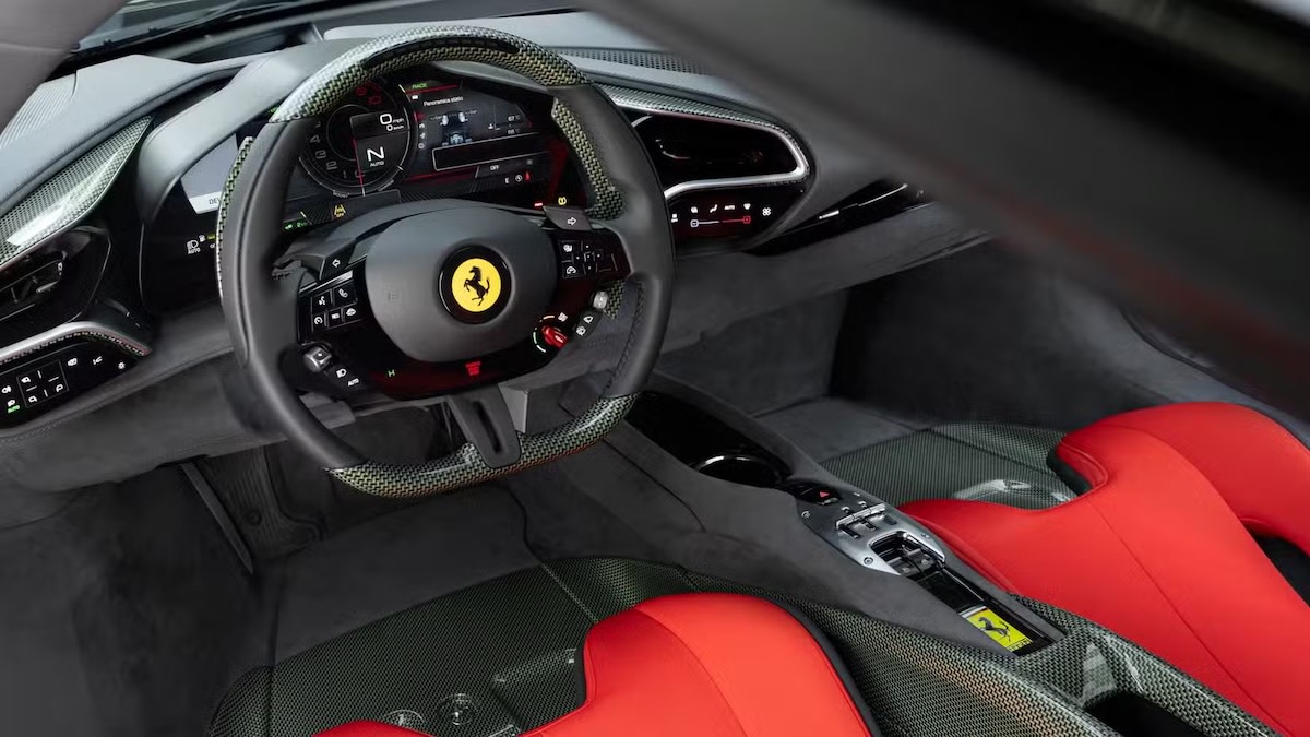 Design-wise, the SC40’s low nose, wide stance, and fixed rear wing are unmistakable nods to its ancestor. The white Bianco SC40 paint, smoked Lexan louvers, and triangular carbon accents echo the F40’s iconic features while blending Ferrari’s newer, more geometric forms. Inside, the same carbon-Kevlar mix defines the cockpit, along with Charcoal Alcantara and red Jacquard fabric.