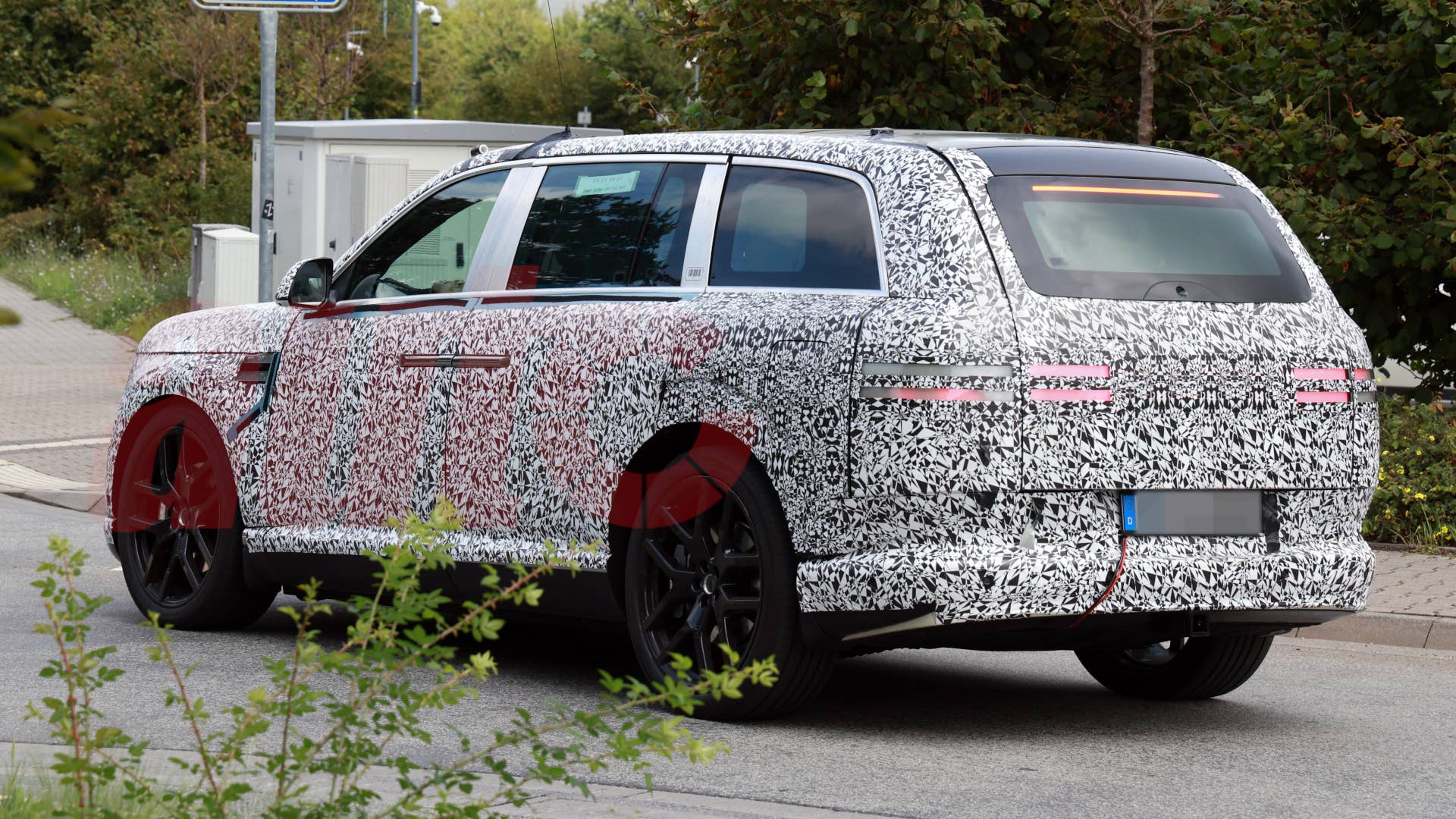 The side windows on this GV90 seem a little small, but the final production design will seem a little better proportioned as the birghtware around the glasshouse is still wrapped in protective tape; black will help the windows and pillars blend together, helping the vehicle look longer. One element of the design that has us scratching our heads a little is the rear windshield, which seems remarkably small for a vehicle of this size. The rearmost side window also appears to be largely blacked out, which could create a blind spot. This decision may have been taken to hide the third row of seating.