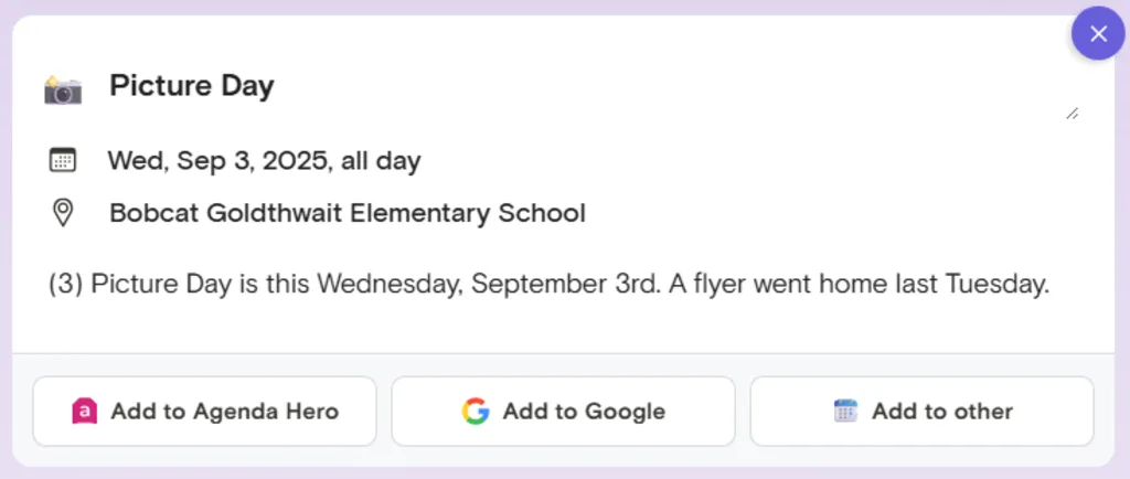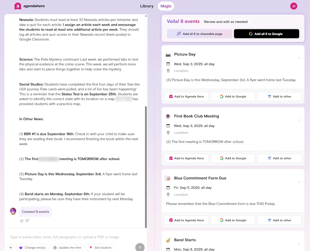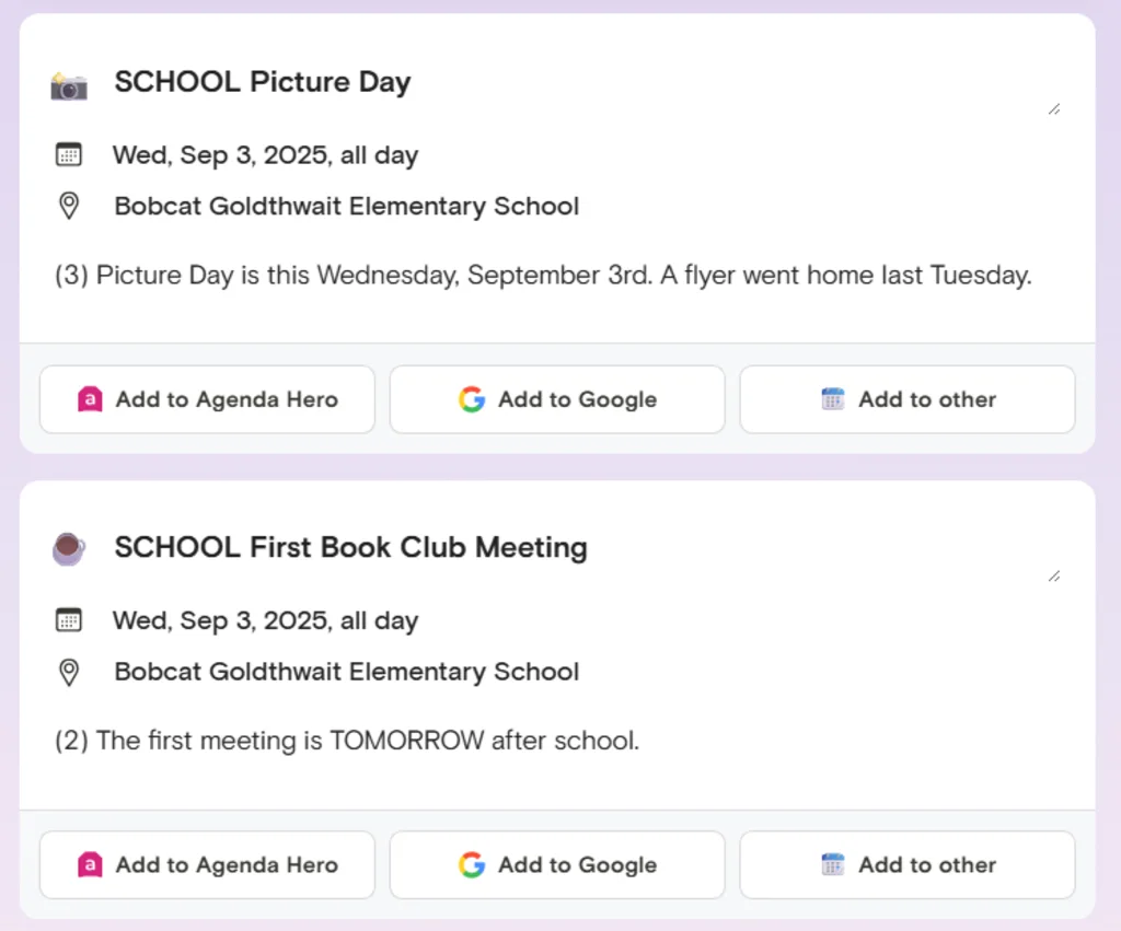 So, for instance, I took a roughly 500-word email newsletter update from my kids’ school and plopped it over into the Agenda Hero website. It had all sorts of information, with important dates and events sprinkled in here and there. And it would’ve been a massive headache to try to find all the date-specific tidbits and add ’em into my calendar on my own.