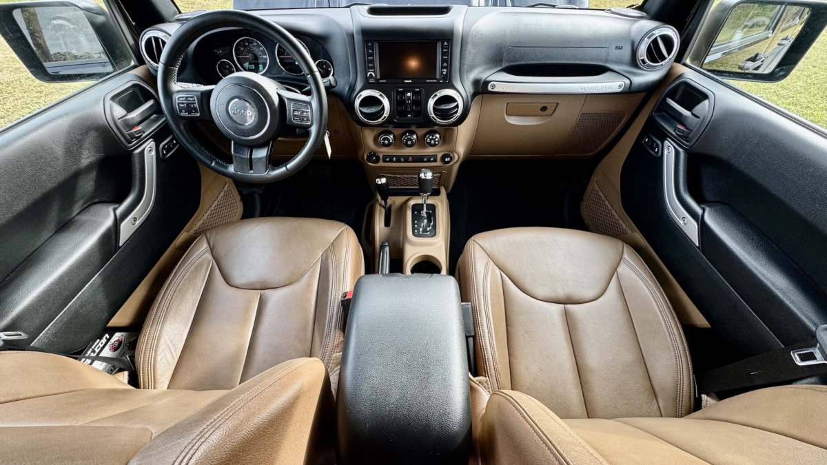Now, Jeep fans know that the 2018 Wrangler is particularly susceptible to the infamous “death wobble,” and since Signature Autosports intends for this to continue being an off-road vehicle, the only change to the setup is the addition of Falcon Piggyback Shocks, so we’d avoid drag racing the build too often. Chewing up the off-road tires on a trail seems like more fun, especially with the whine of the supercharger accessible with a blip of your right foot. With heated front seats, an Alpine nine-speaker sound setup connected to the Uconnect 6.5-inch touchscreen, and a leather-wrapped steering wheel in the tan cabin, it’s a comfortable place from which to venture off the beaten path, though the experience isn’t particularly cheap — this Hellcat-powered Jeep costs $99,950.