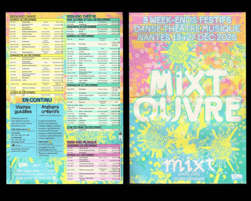 Mixt is a venue of two scales: an indoor complex of performance halls and studios, and an outdoor presence that extends across the Loire-Atlantique region. The brief called for a visual ecosystem capable of holding both. AAAAA’s solution was to anchor the entire identity in a single conceptual observation… that whether you look at the cosmos or through a microscope, everything is composed of particles.