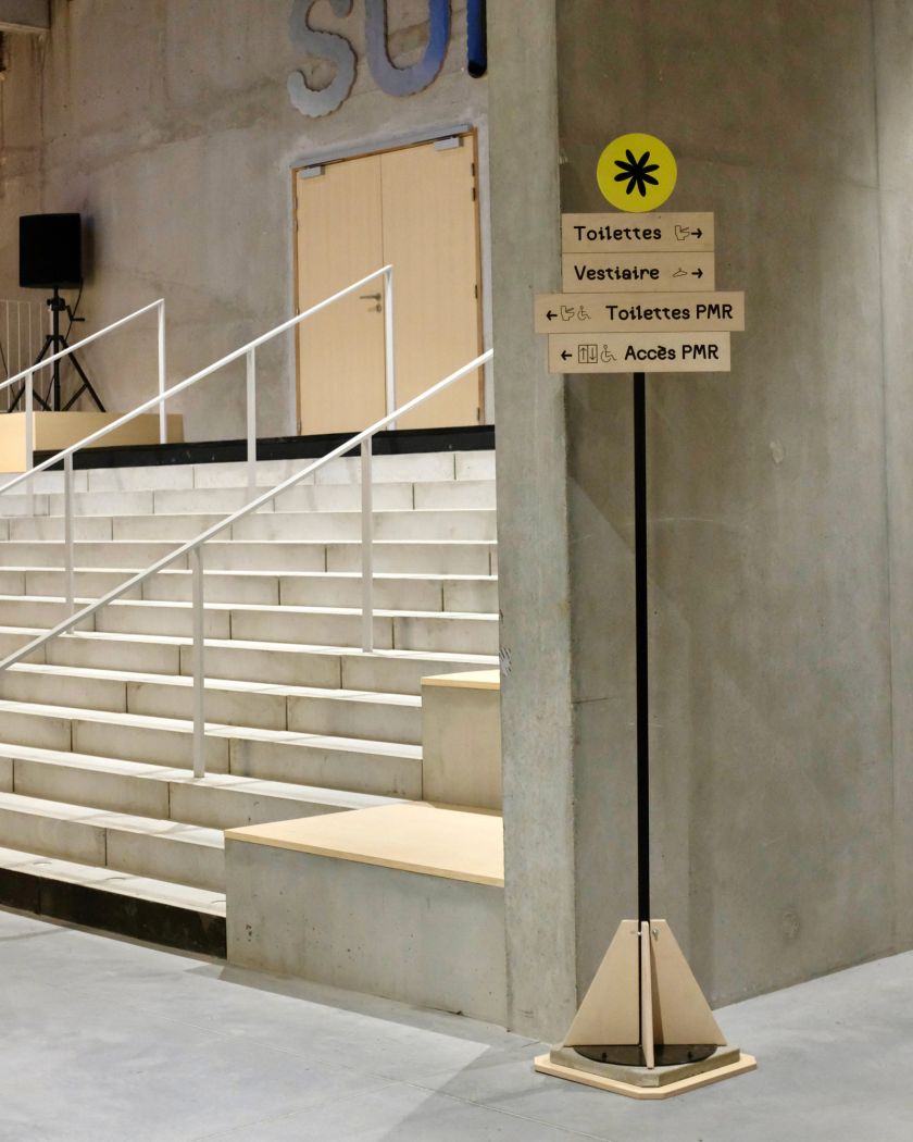 In the physical building itself, wayfinding uses Pollen letterforms applied directly to glass surfaces, celebrating the architecture and surrounding greenery rather than sitting atop them.