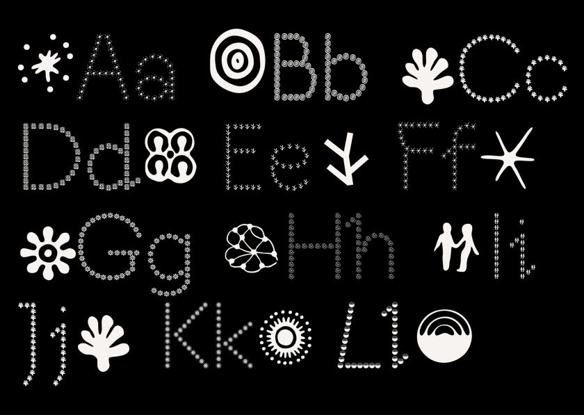 From that idea came Pollen, a custom typeface developed in collaboration with type designer Anne-Dauphine Borione. Rather than letters drawn in the conventional sense, each character in Pollen is constructed from modular shapes – small repeated units that cluster together to form letterforms. The inspiration was literal: microscopic photography of pollen grains, with their incredible variety of surface textures and structures. The resulting alphabet has an organic, almost biological quality, somewhere between scientific illustration and street art.