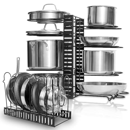 GeekDigg Adjustable Pots and Pans Organizer | 8 Tier Versatile Kitchen Pot Rack for Counter & Cabinet – Easy Setup, 3 DIY Installation Methods, Accommodates 8+ Pots & Pans – Space-Saving Black Design