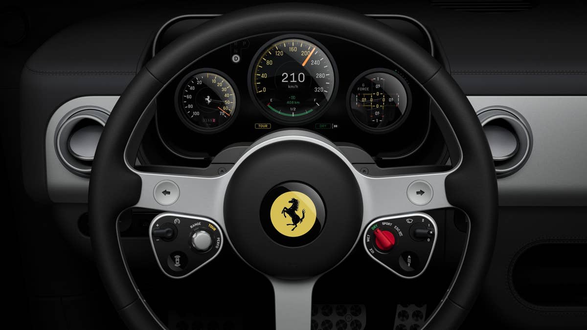 Speaking of the steering wheel, it features an old-school look with three aluminum spokes but it’s also modern, using physical control pods along with Ferrari’s hallmark Manettino rotary dial, which has been repurposed for an electric powertrain, acting as a power-flow selector. The steering wheel also includes buttons for the turn signals, wipers, and a dial for the drive mode selector—the Luce features three modes: Range, Tour and Perfo.