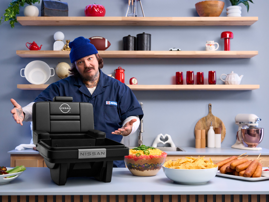 The press release doesn’t explicitly confirm that Nissan has a spot for the upcoming NFL championship game, though the Japanese marque appears to be capitalizing on the surrounding hype through a collaboration with Canadian chef and actor Matty Matheson, who stars in the FX series The Bear. In the campaign, Matheson loads his fictional dip seat – packed with chips – into the Rogue before race car driver and Gran Turismo actress Emelia Hartford takes the vehicle for a spin.