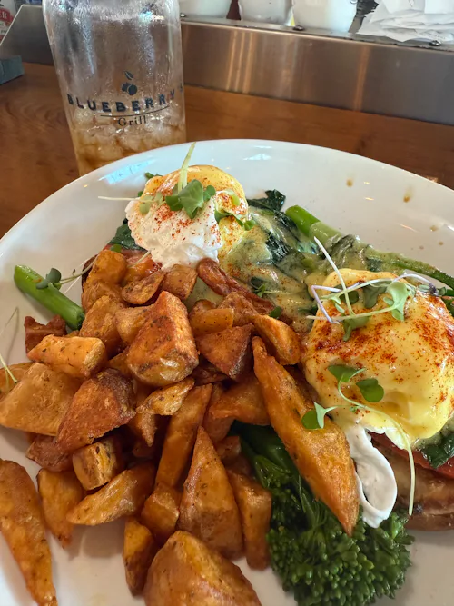 - Blueberry’s Grill at Barefoot Landing: This spot came highly recommended by our kayaking tour guide, and I’m so glad we decided to follow through and check it out. Think Southern comfort food with a creative twist, like Florentine broccolini benedicts and crab cake sandwiches. Inside feels cozy and modern, like something out of Joanna Gaines’ playbook, and I swear I would drive back right now for another serving of their blueberry hushpuppies.