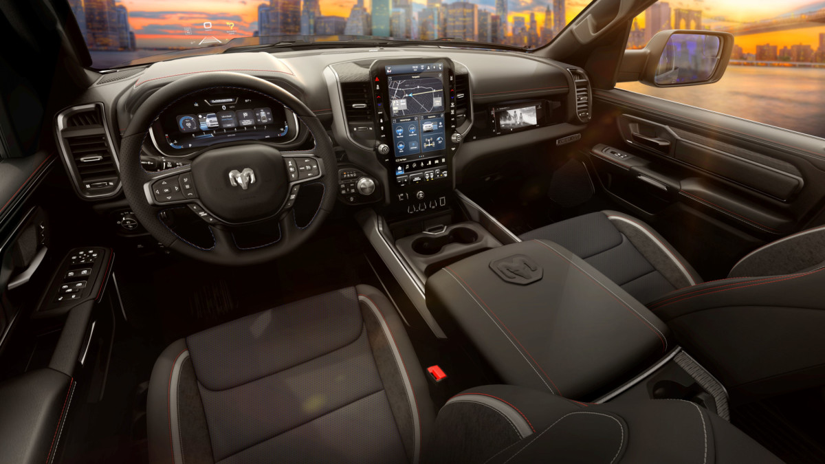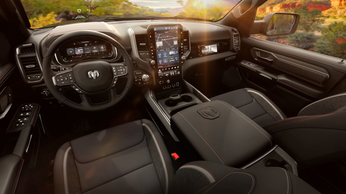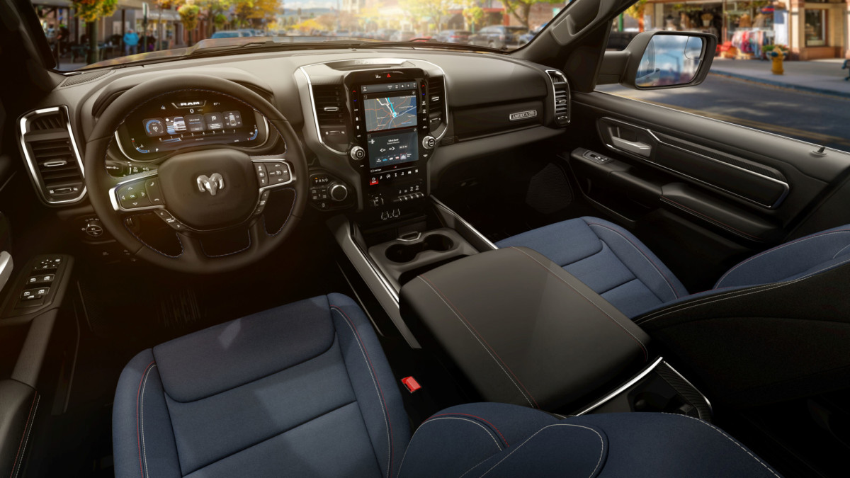 The Laramie version of the Ram 1500 America250 special edition gets a fancy Gloss Black billet grille, again with a body-color surround, and 22-inch aluminum wheels in black, while the Rebel makes do with 18-inch wheels wrapped in all-terrain rubber. The Rebel also gets a mesh grille, this time with a Satin Black surround, a powder-coated black front bumper with integrated tow hooks, and a low-gloss black rear bumper. The latter finish also appears on the fender flares, and those willing to spend a little extra can get the lower body painted in Diamond Black Crystal Pearl-Coat paint. Finally, the Rebel America250 special edition gets black lighting bezels, but sadly, Stellantis hasn’t provided detailed images of the exterior of each special edition, so we’ll have to squint at the header image at the top of this article.