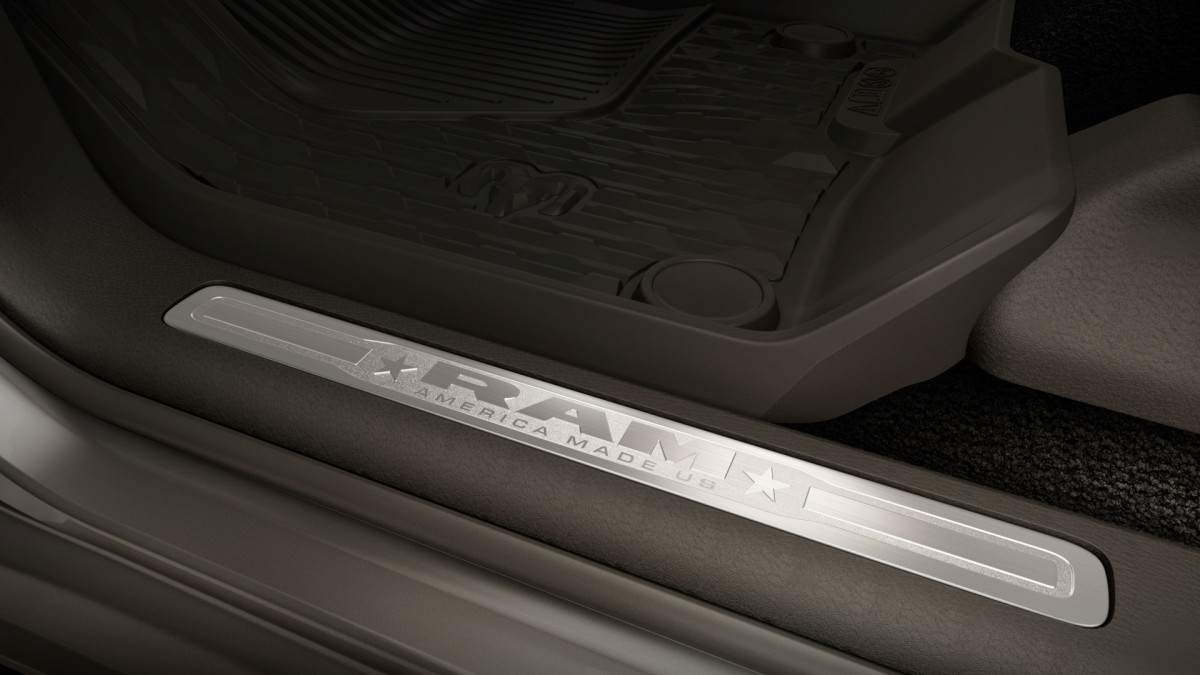Inside, both Laramie and Rebel special editions benefit from leather performance seats with perforated Blue Crust centers, Graphite Metallic-trimmed bolsters, and red, white, and blue stitching. This also appears on the leather-trimmed dash, door uppers and armrests, center consle lid, and steering wheel. Again, the upper seatbacks get embossed Velcro logos for patches, the same start-up graphic as the Big Horn, a Satin Chrome emblem on the passenger side instrument panel, a custom leather key tag, and America Made Us door sill scuff plates. So what does all this cost?