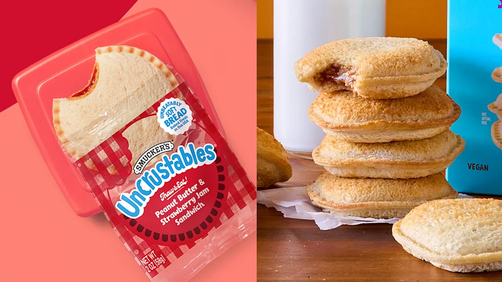 There are other crustless sandwich brands that don’t use the Uncrustables-style circular shape and crimped design, like the square-shaped Jams and Walmart’s Great Value No Crust Sandwich. Chubby Snacks originally launched with circular sandwiches before getting hit with a cease-and-desist from Smucker. It pivoted in 2021 to a cloud-shaped sandwich.