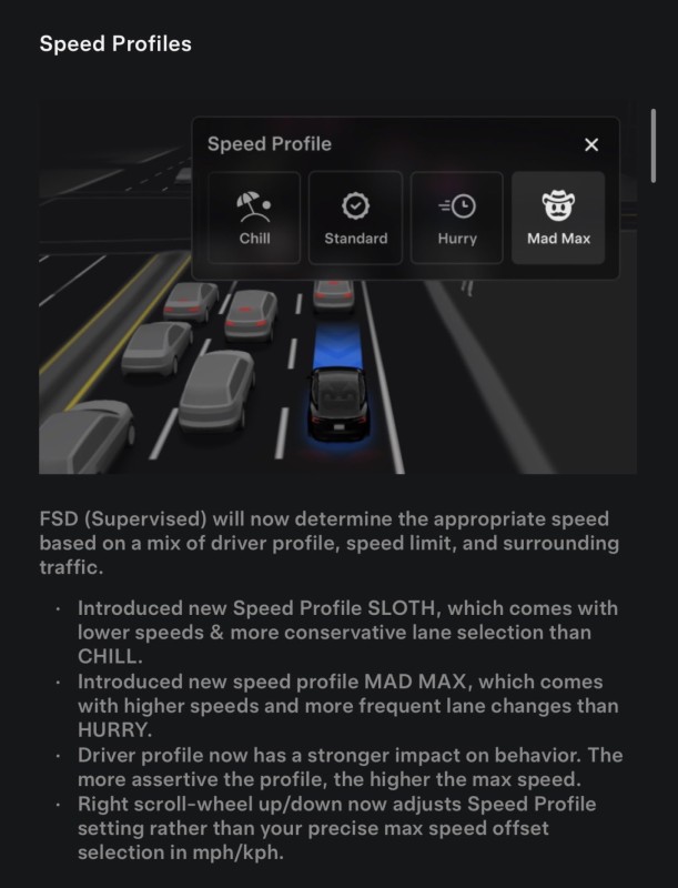 According to Tesla’s release notes for the Mad Max speed profile, it “comes with higher speeds and more frequent lane changes than Hurry,” previously the most excitable of the various driving profiles.