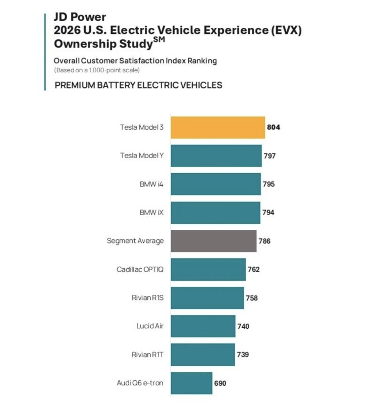 JD Power has released the results of its 2026 U.S. Electric Vehicle Experience (EVX) Ownership Study, an assessment of EV and plug-in hybridowner satisfaction. Focused on the first year of ownership, the study considers not only the car itself, but also factors like public charging availability. The good news is that EV owner satisfaction has reached its best level since the study’s inception six years ago, despite EV market share cooling off in recent months. Tesla put in a strong showing, while EVs from Honda and Audi did not.