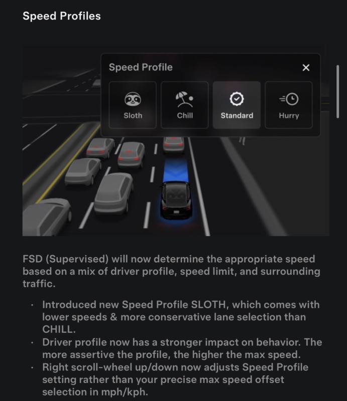 FSD will now decide on the appropriate speed, based on a combination of traffic conditions, speed limit, and the driver’s profile. Sloth is a new speed profile, which means the car will drive itself at lower speeds and choose more conservative lane selections than Chill mode. Interestingly, in an early livestream of FSD 14.1 being tested, more than one user said Sloth mode doesn’t quite live up to its name—it guides the car at the speed limit, not below it as expected. It was also noted that 14.1 felt a bit jerky, but 14.2 is expected to address this.