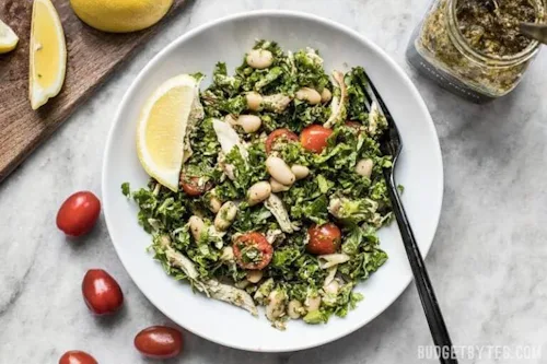 If you love a salad for lunch but want to make sure it holds you over ‘til you get home, try Budget Bytes’ kale, white bean, and pesto salad. The beans and chicken will keep you full, while all the veggies add freshness and fiber. Personally, I’d throw some feta on top too.
