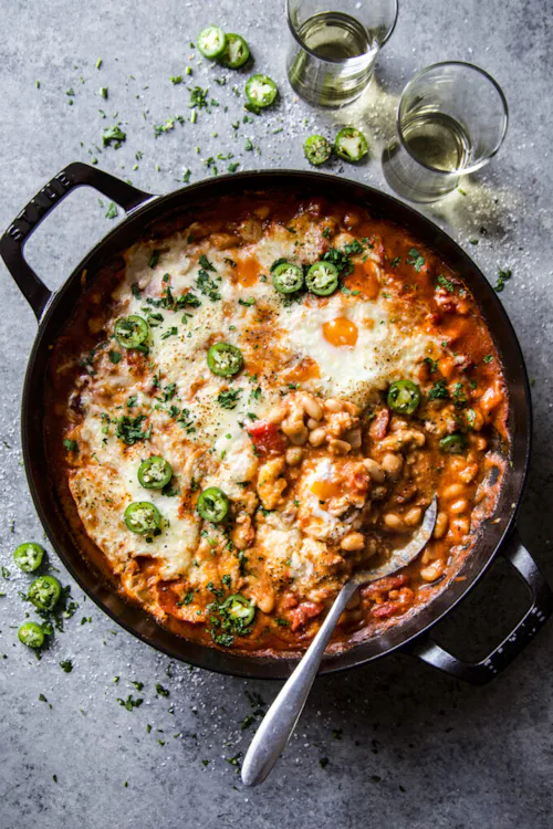 Another 30-minute white bean skillet dinner: The Curious Plate’s chorizo and white bean enchilada skillet. It’s a delicious melting pot of spicy chorizo, white beans, eggs, and cheese, which you can top with all the jalapeños and cilantro your heart desires.