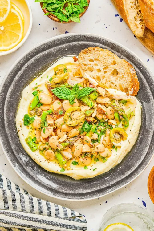 Averie Cooks’ recipe looks absolutely heavenly. The marinated beans, asparagus, and olives get piled on top of hummus, whipped feta, or whipped ricotta, and topped with fresh mint and lemon. Spoon it onto some crusty bread and have it for lunch or take it to a party, but be prepared to leave with an empty dish.