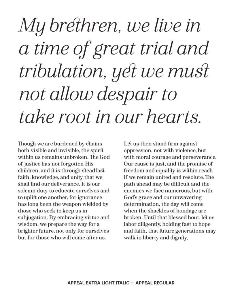 Practically speaking, We Appeal serves as a capable text serif suitable for contemporary use. It’s a typeface that invites contemplation of typography’s relationship to power, voice and representation. For designers and institutions working with themes of social justice, historical documentation or cultural preservation, We Appeal offers more than aesthetic choice; it provides typographic voice with genuine historical resonance and purpose.