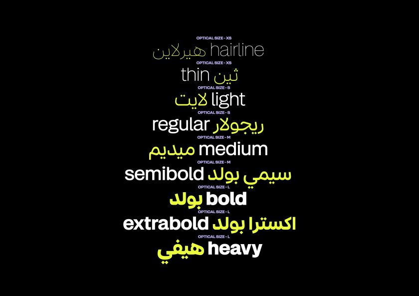 The family matches its Latin companion, Sets Grotesk, in breadth: nine weights across four optical sizes. Whilst smaller text sizes recede appropriately into background readability, the large optical size undergoes a complete personality transformation. Character skeletons widen, connections shorten, counters expand. The result is typography designed to capture attention and stand out, with long teeth, larger dots, and wider proportions that create a distinctive presence.