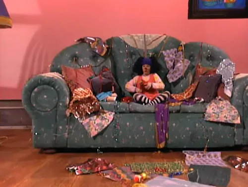 If the specifics are a little hazy, let me remind you of The Big Comfy Couch’s premise: young clown Loonette lives with her best friend, a sentient doll named Molly, and they spend a lot of time on their giant floral-patterned couch. They read together, do stretches on Loonette’s clock rug, and do 10-second tidies of various messes. For her part, Molly doesn’t talk much, but she ardently believes in living, breathing dust bunnies residing under their couch (which they do — they’re named Fuzzy and Wuzzy). Loonette and Molly also pay visits to Loonette’s grandmother, Granny Garbanzo, and her cat Snicklefritz, as well as other Clowntown residents, like Major Bedhead, the town’s mailman.‌