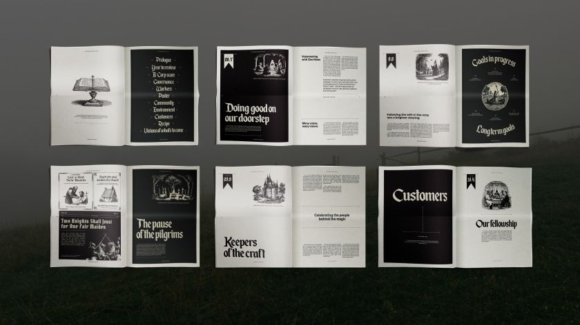 The visual language draws heavily from early printed ephemera. Creative director Oli Garnett and the team created illustrations using Midjourney, deliberately training the AI to mimic 18th-century chapbook woodcuts. The typography uses blackletter display faces alongside carefully considered body copy. Every spread feels textured, lived-in, deliberately non-corporate.