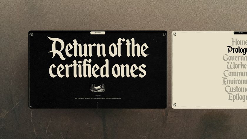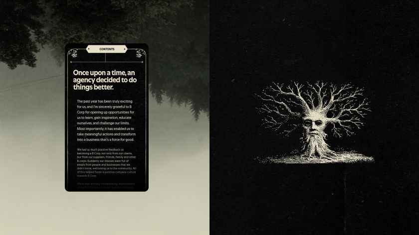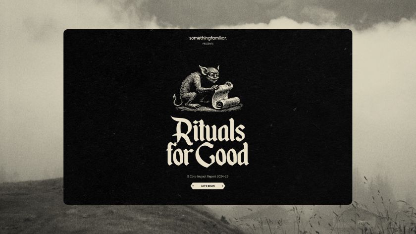 It’s a provocative choice. At a moment when greenwashing prosecutions are on the rise and purpose-led claims face unprecedented scrutiny, deliberately framing your impact work as folklore could read as flippant. But Something Familiar’s approach does something cleverer: it acknowledges the scepticism while demonstrating the rigour that sits beneath it. The report covers all five B Corp pillars (Governance, Workers, Community, Environment and Customers), but wraps the data in a narrative about metamorphosis and faith.