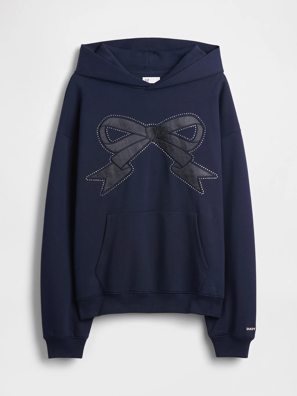 The Sandy Liang hoodies also show how Gap is improving the quality of its overall product lines. They have a boxy contemporary fit but also a weighty hand feel that led me to inquire about the fleece make itself. The company told me it expanded its fleece assortment last fall to include “heavyweight” (400 grams per square meter) and “extra heavyweight,” (650 grams per square meter) its most premium fleece offerings to date. The Sandy logo hoodie is extra heavyweight, and the bow hoodie is heavyweight, which establishes quality in addition to exclusivity as a limited drop. It also released the classic Arch Logo hoodie in extra heavyweight fleece this month.